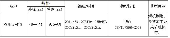 用于制作煤矿开采用的液压设备、汽车起重机用的液压缸、柱塞等,其中液压支柱用无缝管需求量 大。用户要求液压支柱管具有很好的使用安全性、可靠性。我公司生产的液压支柱管具有化学成分波动范围小、有害元素含量低、钢质纯度高、内外表面质量好、几何 尺寸精度高、性能稳定。满足用户提出的液压支柱管使用安全性、可靠性要求。